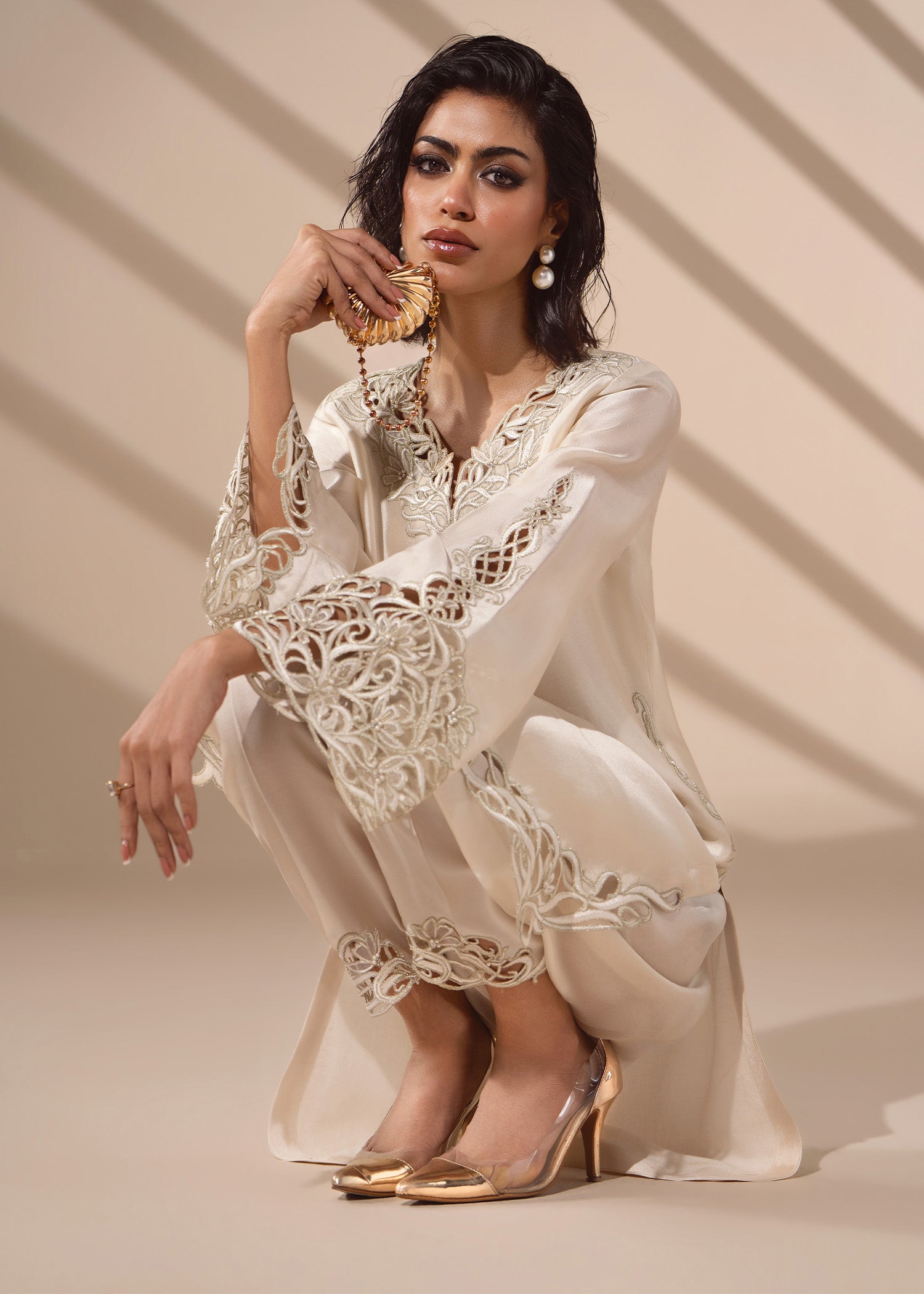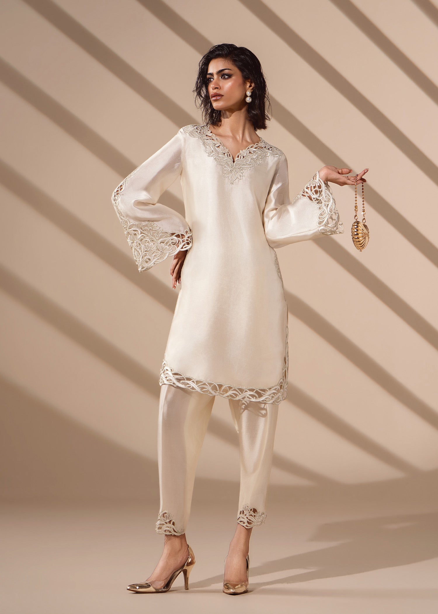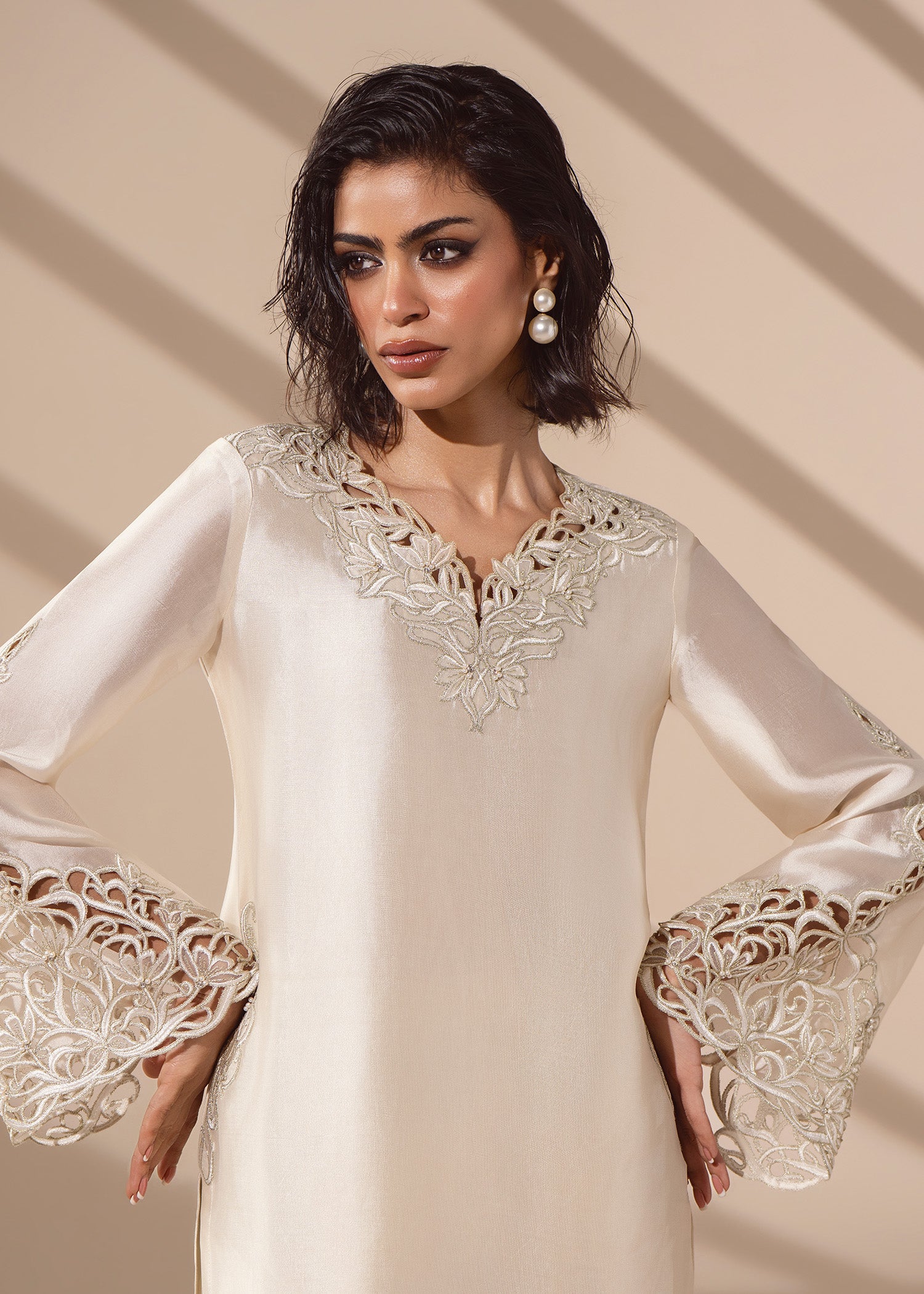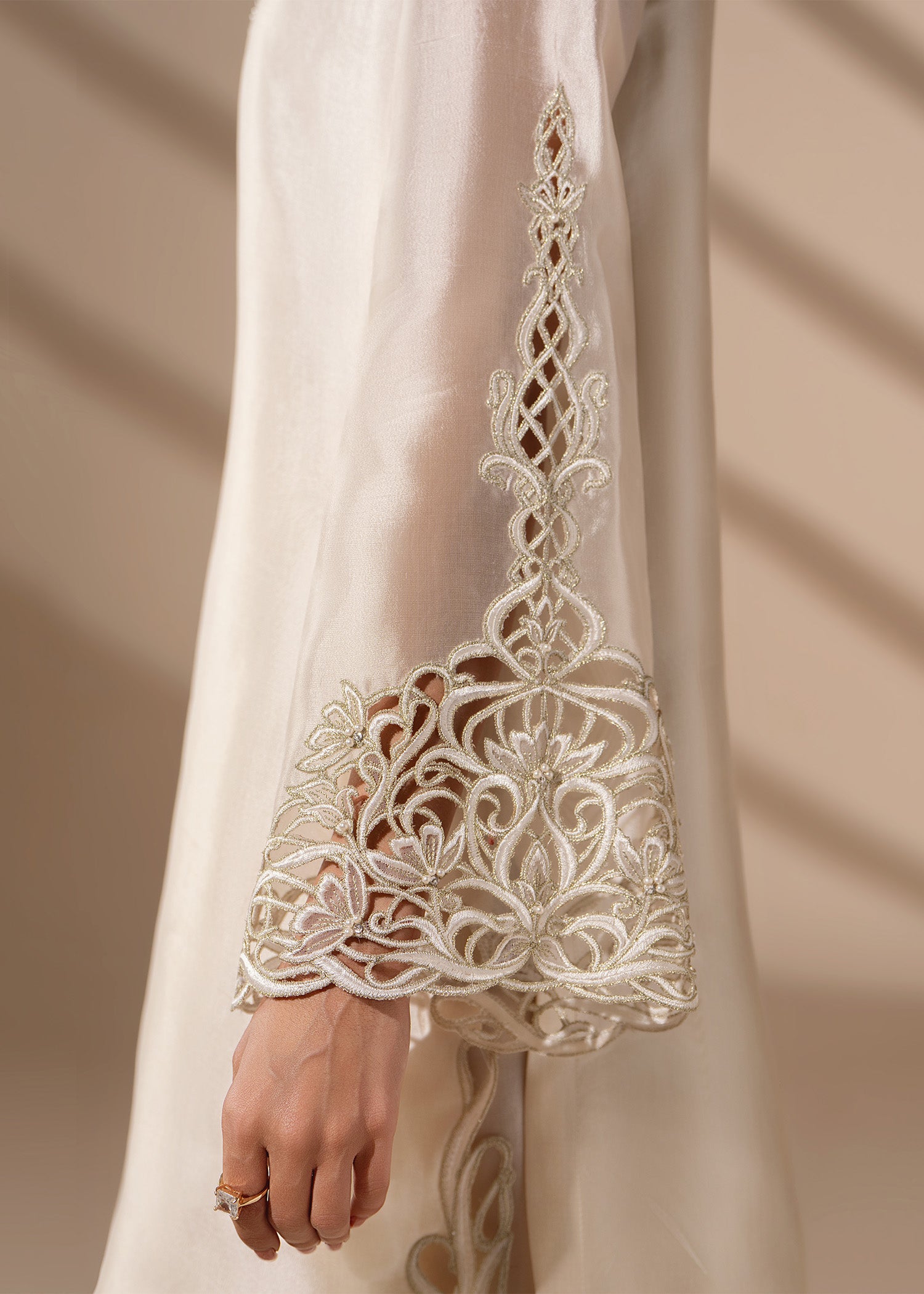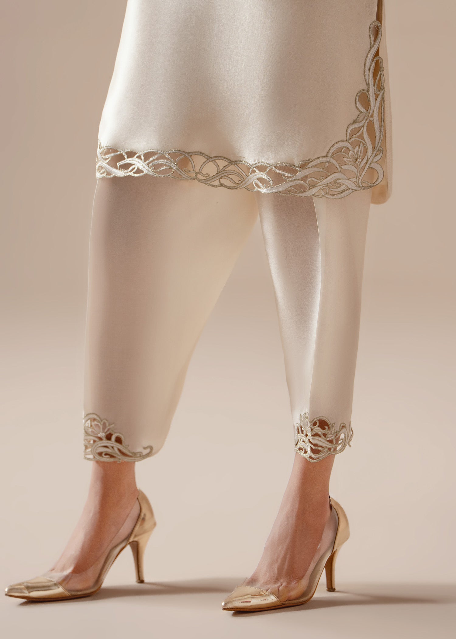 Ivory tissue silk cut with couture precision. Delicate cutwork traces the, neckline, sleeves and hem, paired with a narrow shalwar and a finely detailed dupatta that mirrors the craftsmanship at both ends.