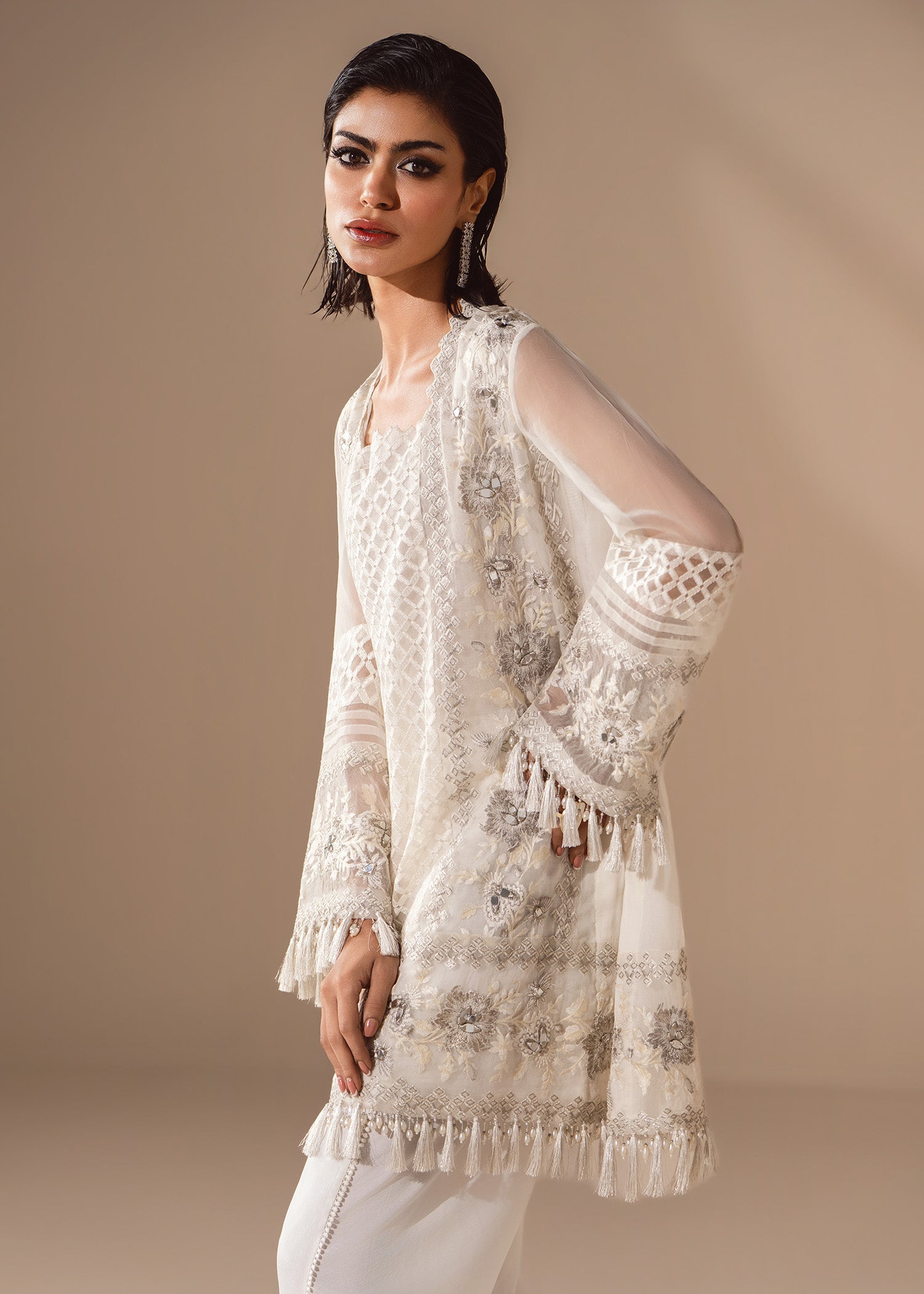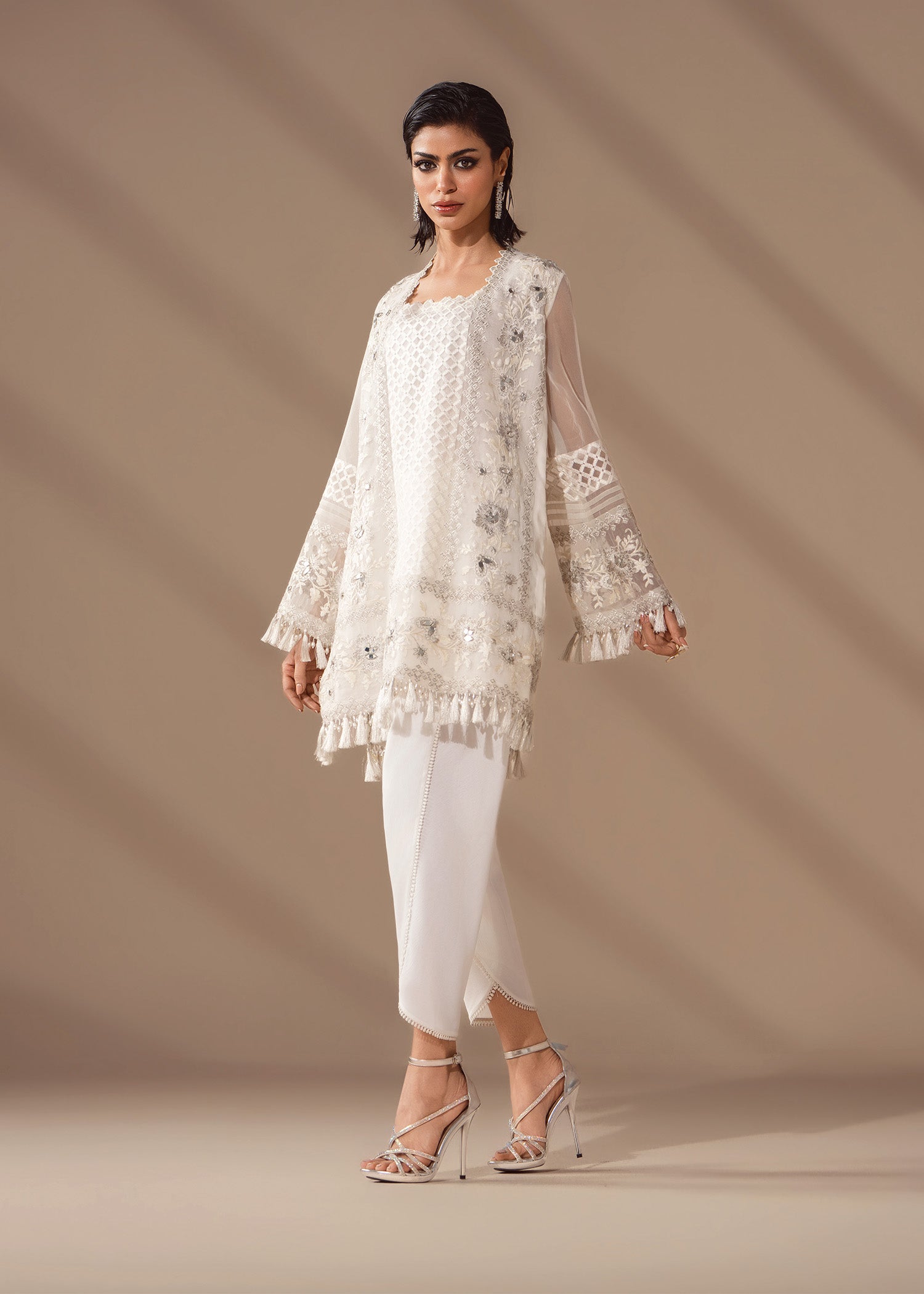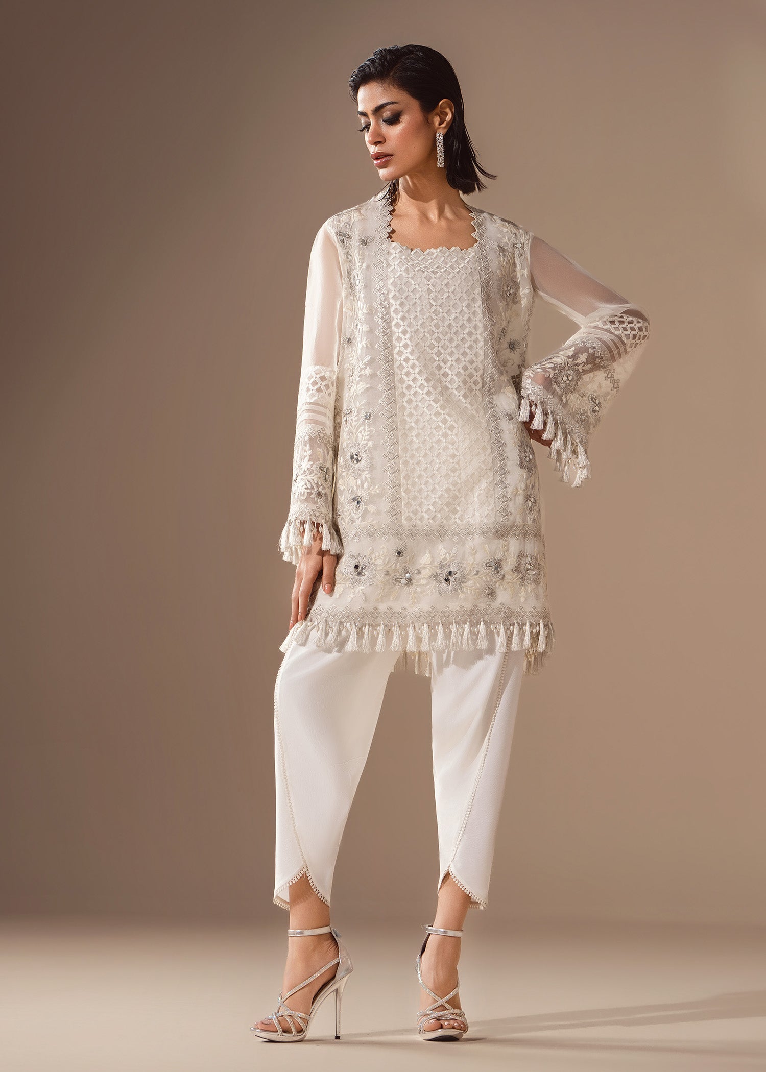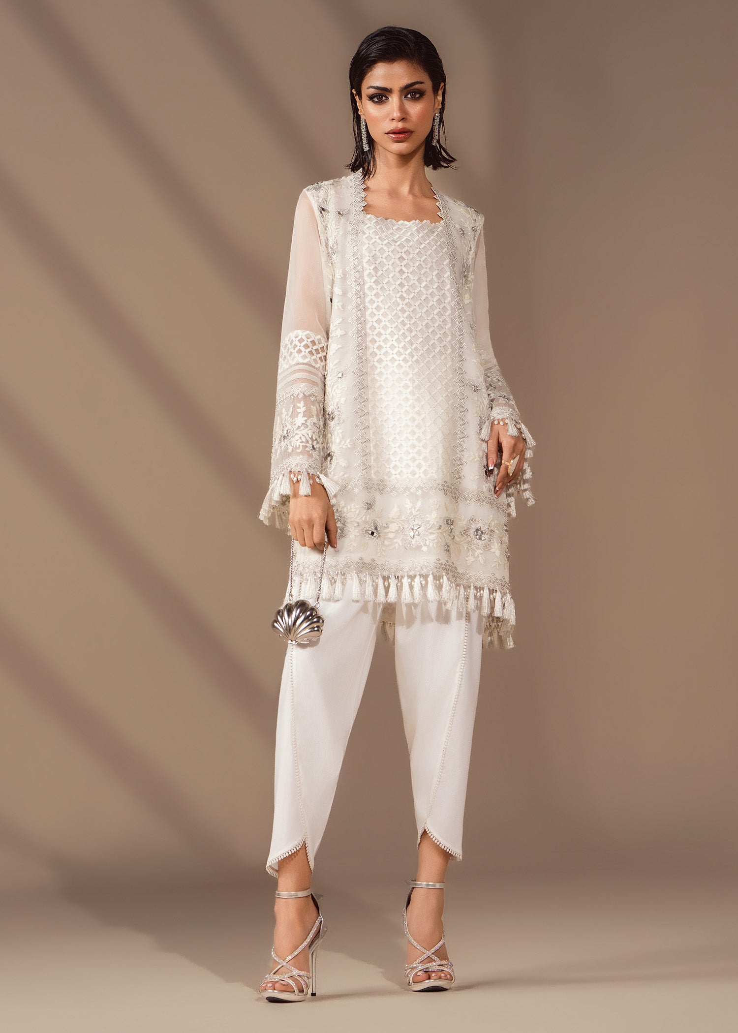 A flirty organza shirt fully embroidered in white on white, touched with pearls, mirrors and sequins. Balanced by a fluid tulip shalwar in crepe silk. Be sure to experience structured ease with quiet sparkle.