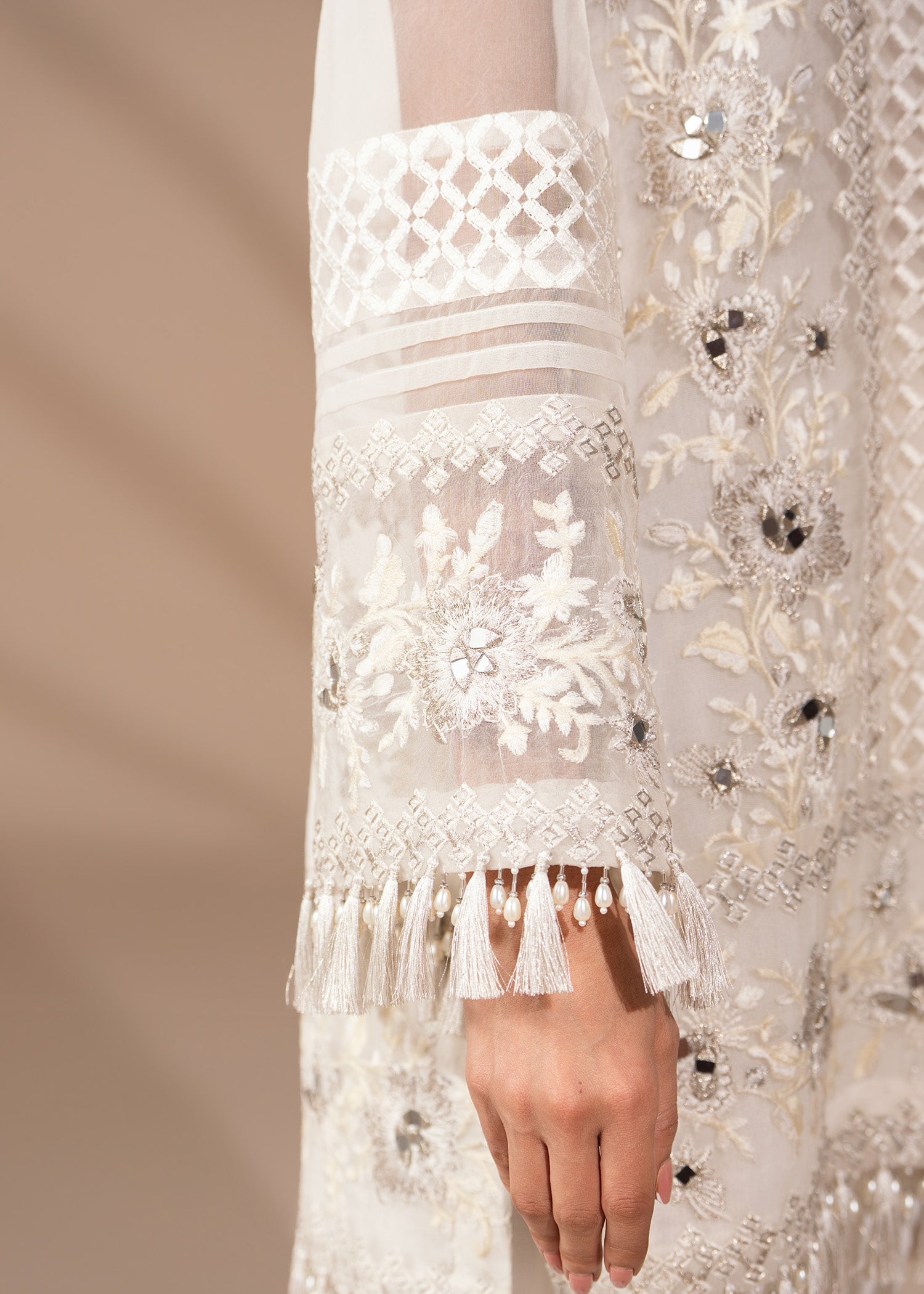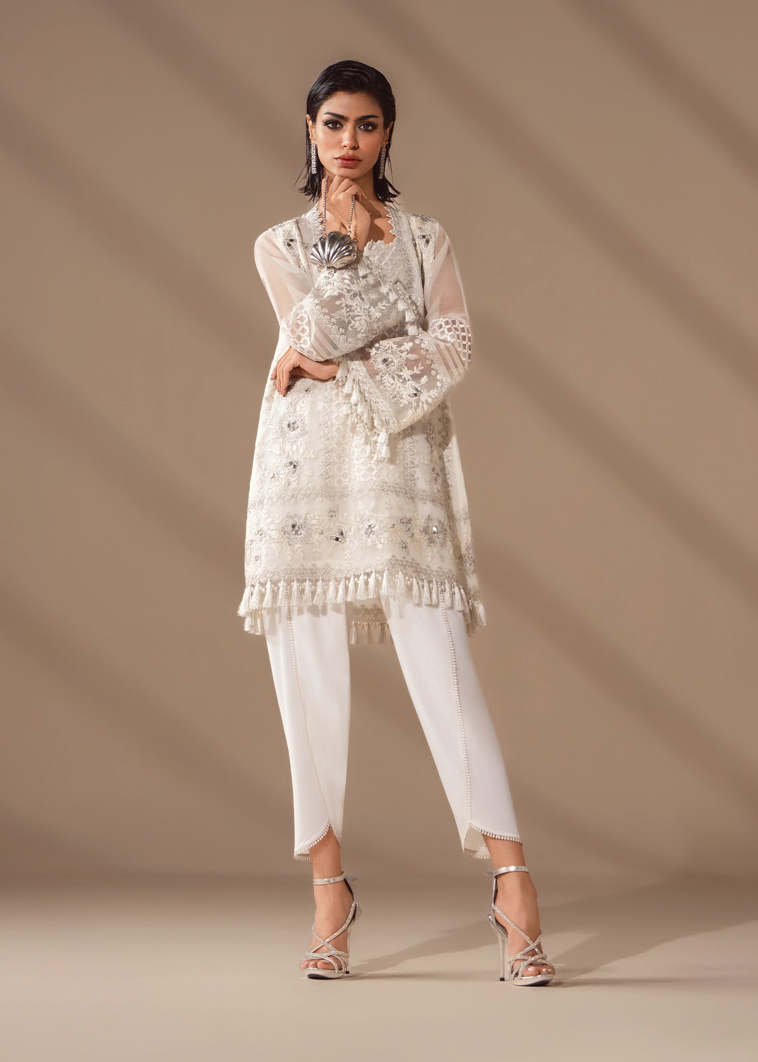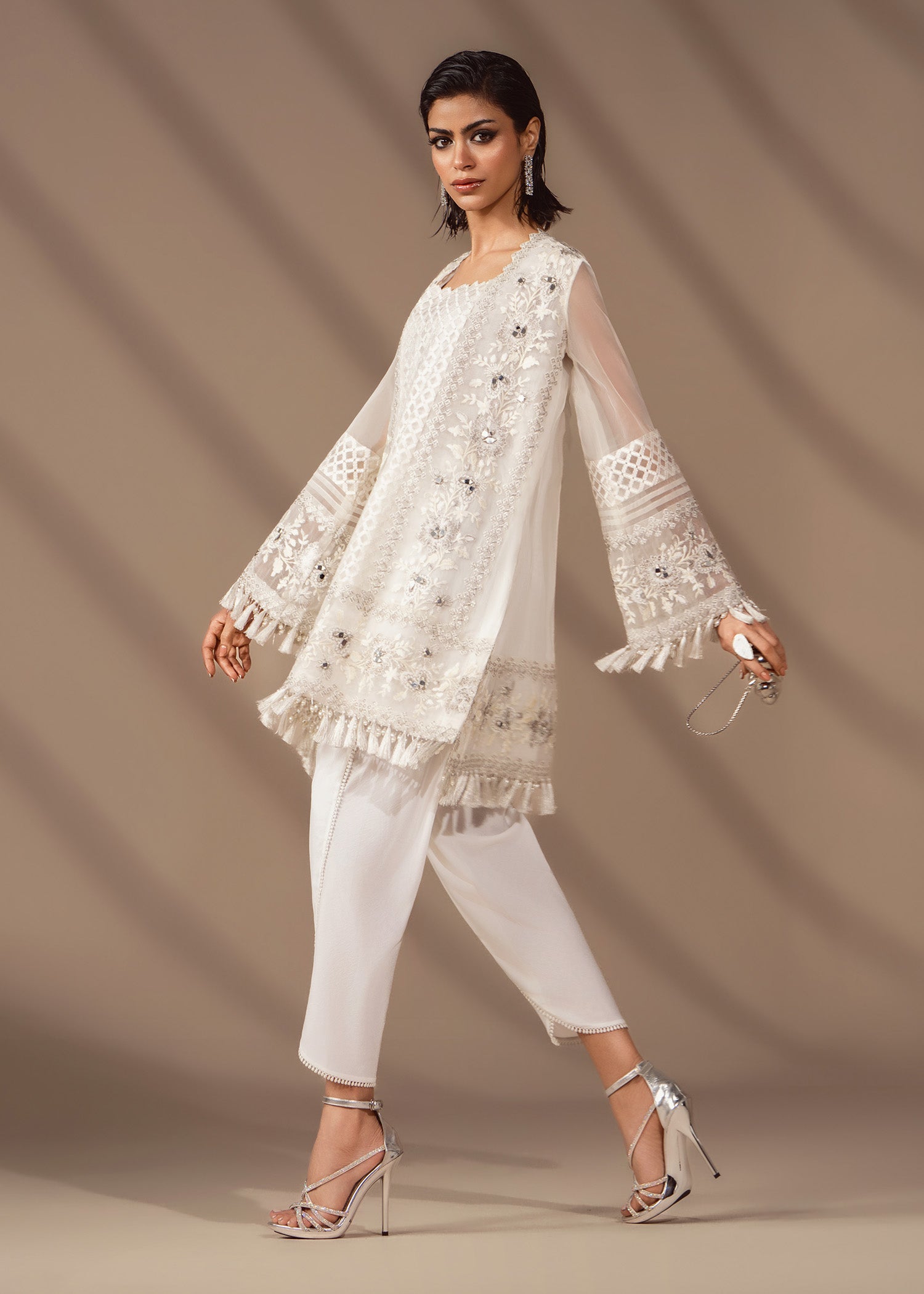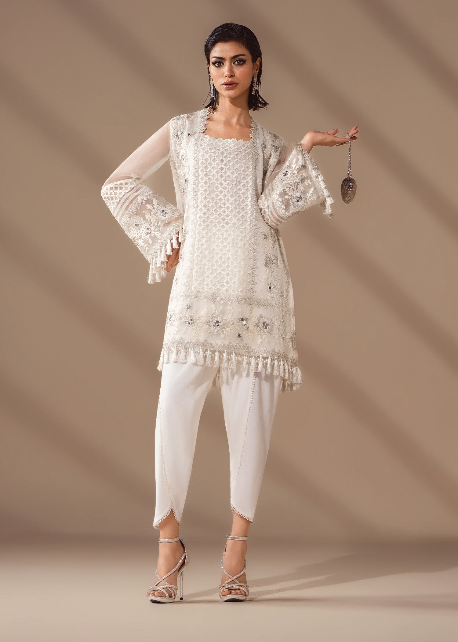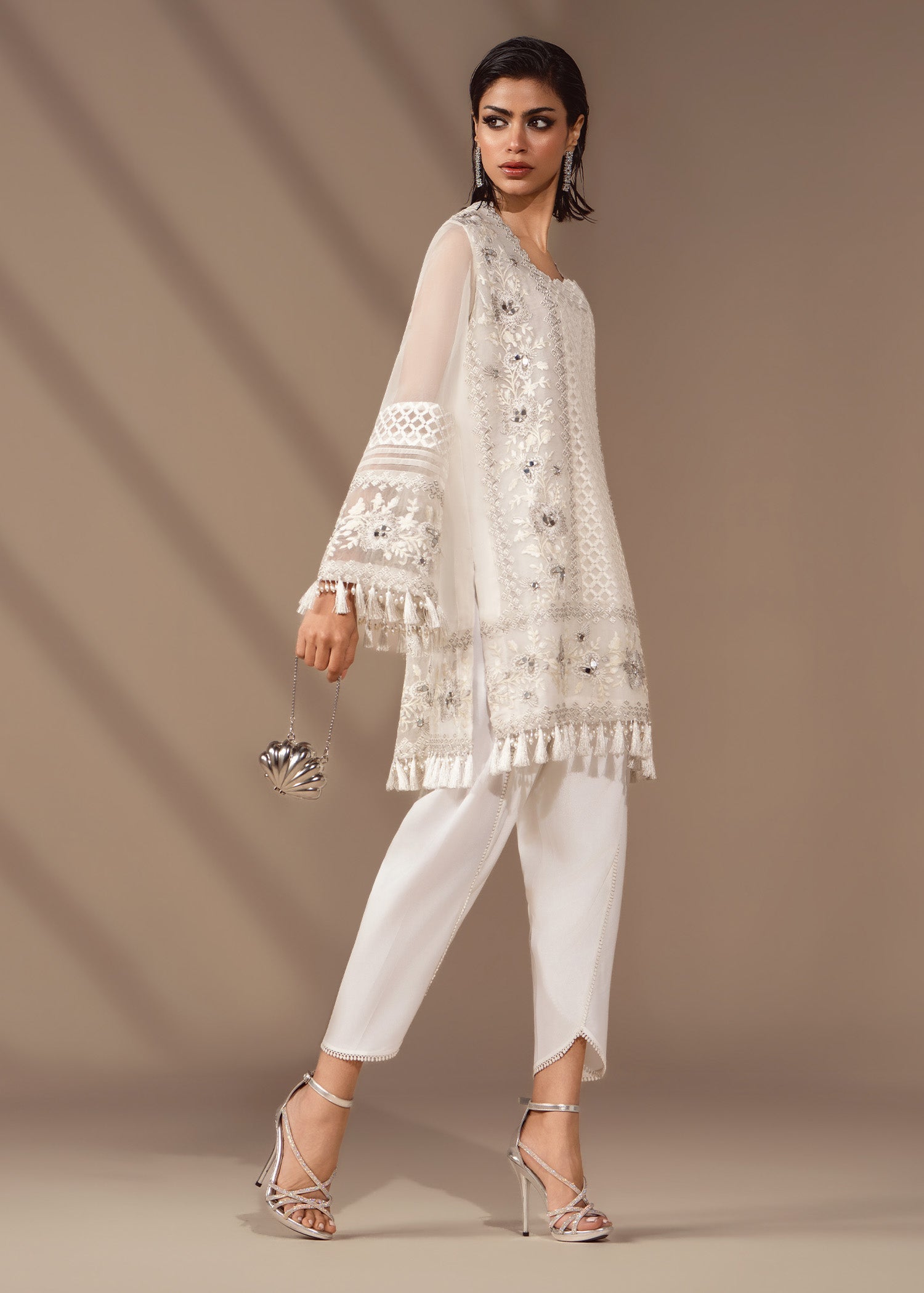 A flirty organza shirt fully embroidered in white on white, touched with pearls, mirrors and sequins. Balanced by a fluid tulip shalwar in crepe silk. Be sure to experience structured ease with quiet sparkle.